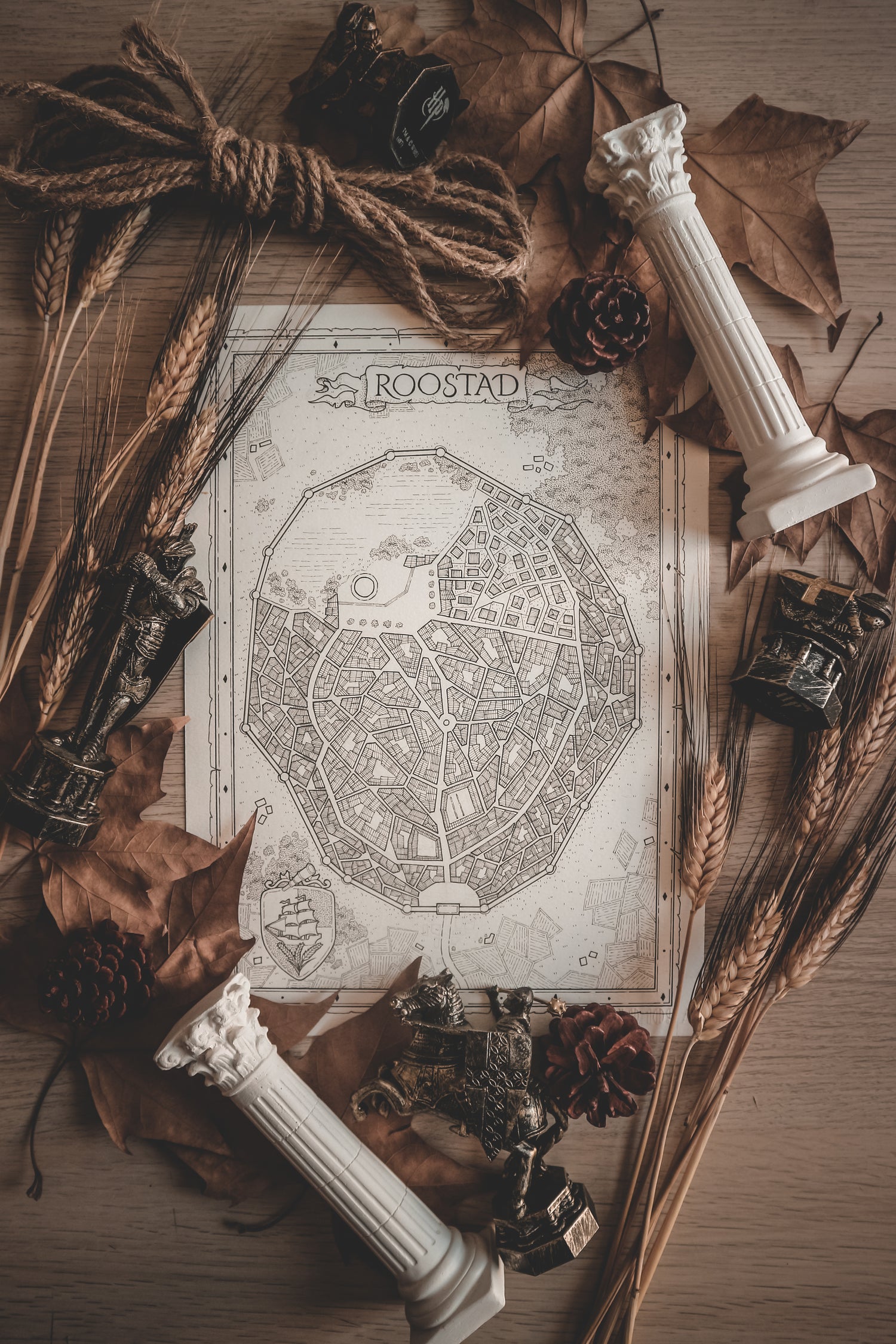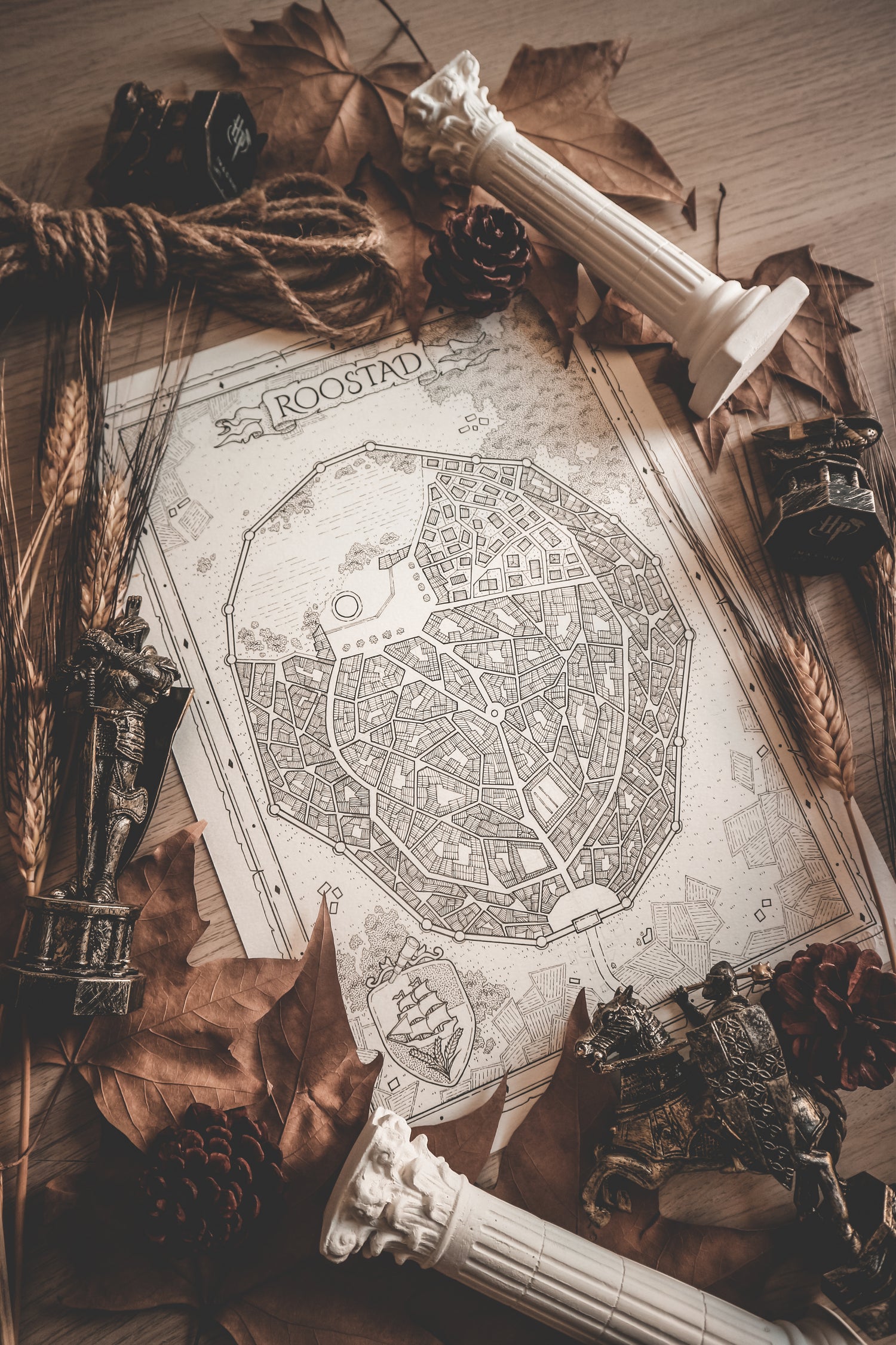On the map you can see the main streets and buildings that make up the city, as well as its coat of arms.