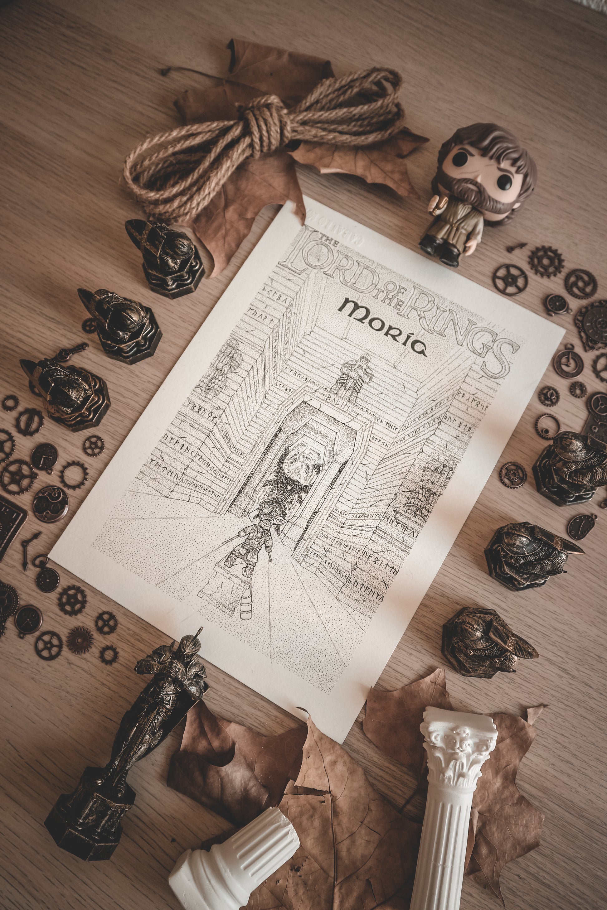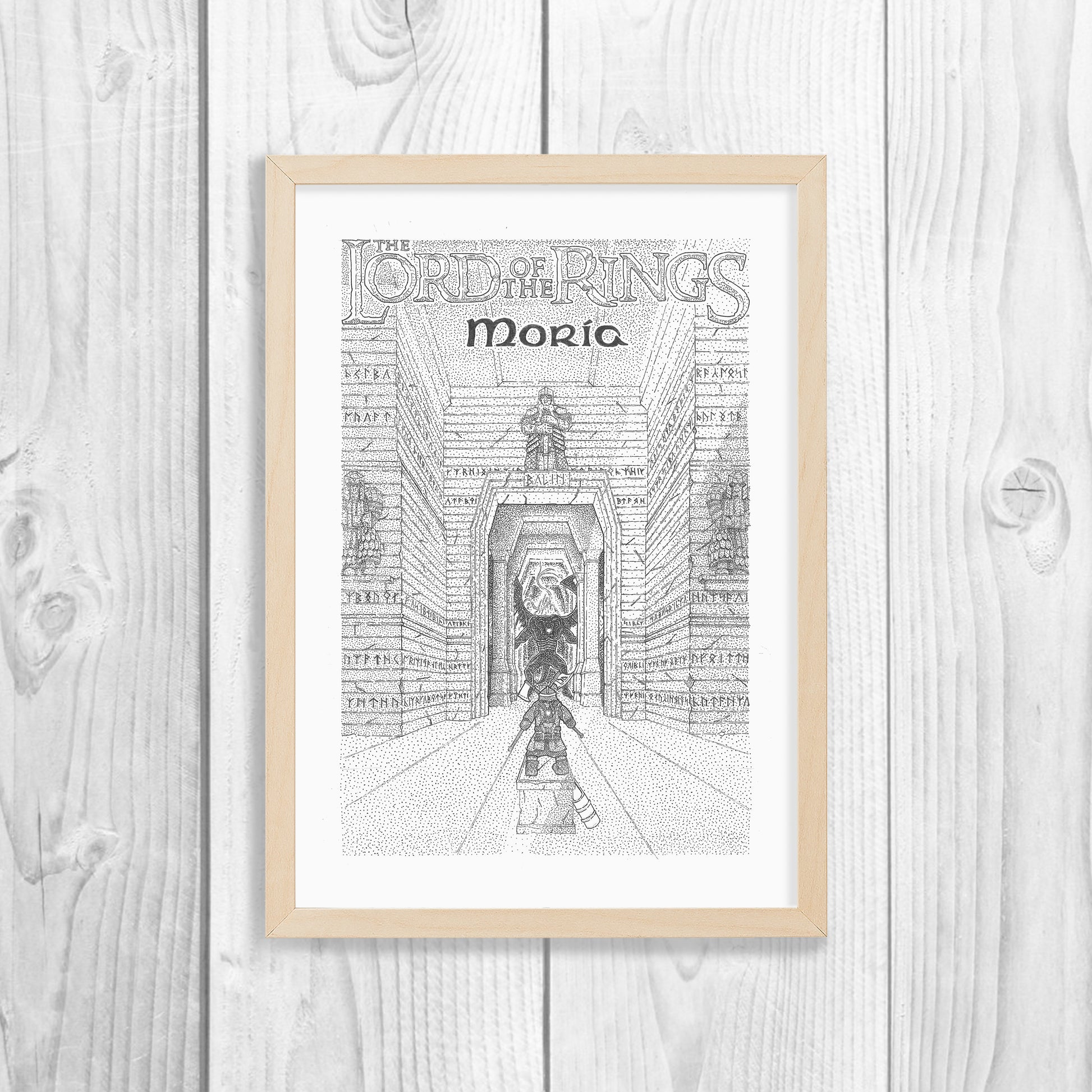 🎨 En la ilustración aparece el enano Gimli preparándose para la batalla en la tumba de Balin, en el interior de las Minas de Moria, justo en el momento del ataque del Balrog.