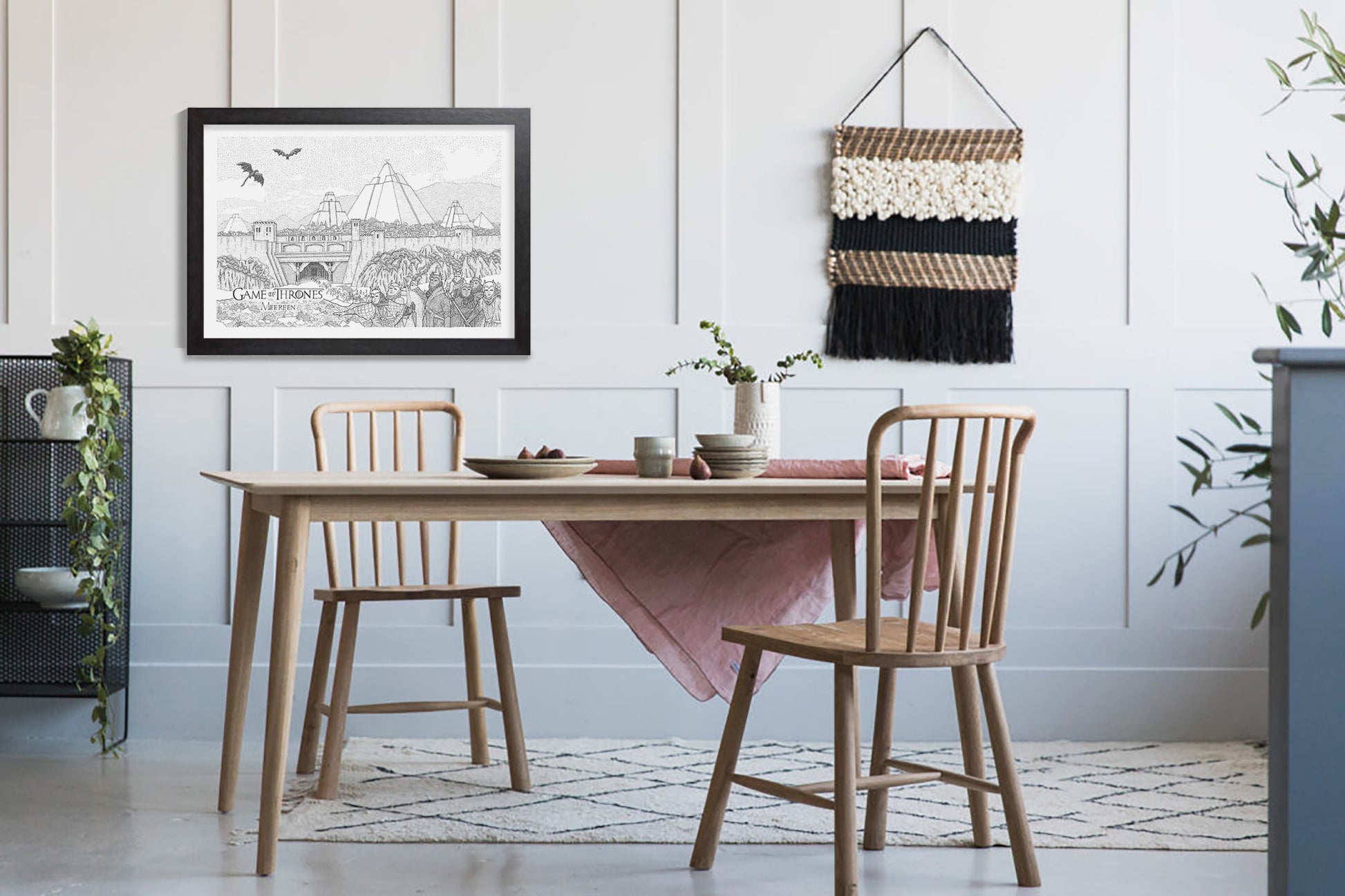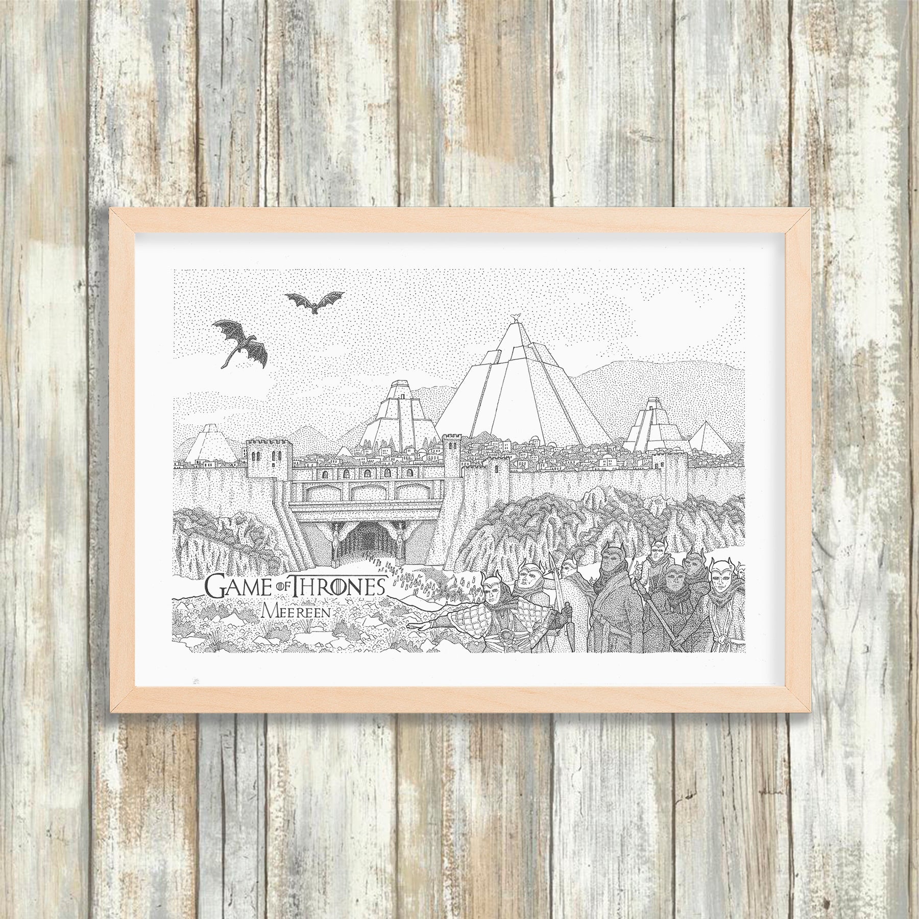 🎨 En la ilustración aparece una perspectiva aérea de la ciudad de Meereen de la serie de HBO "Juego de Tronos", basada en los libros "Canción de Hielo y Fuego" de George R.R.Martin. En la escena se puede ver a los hijos de la arpía huyendo de la ciudad tras la vuelta de la Khaleesi Daenerys Targaryen