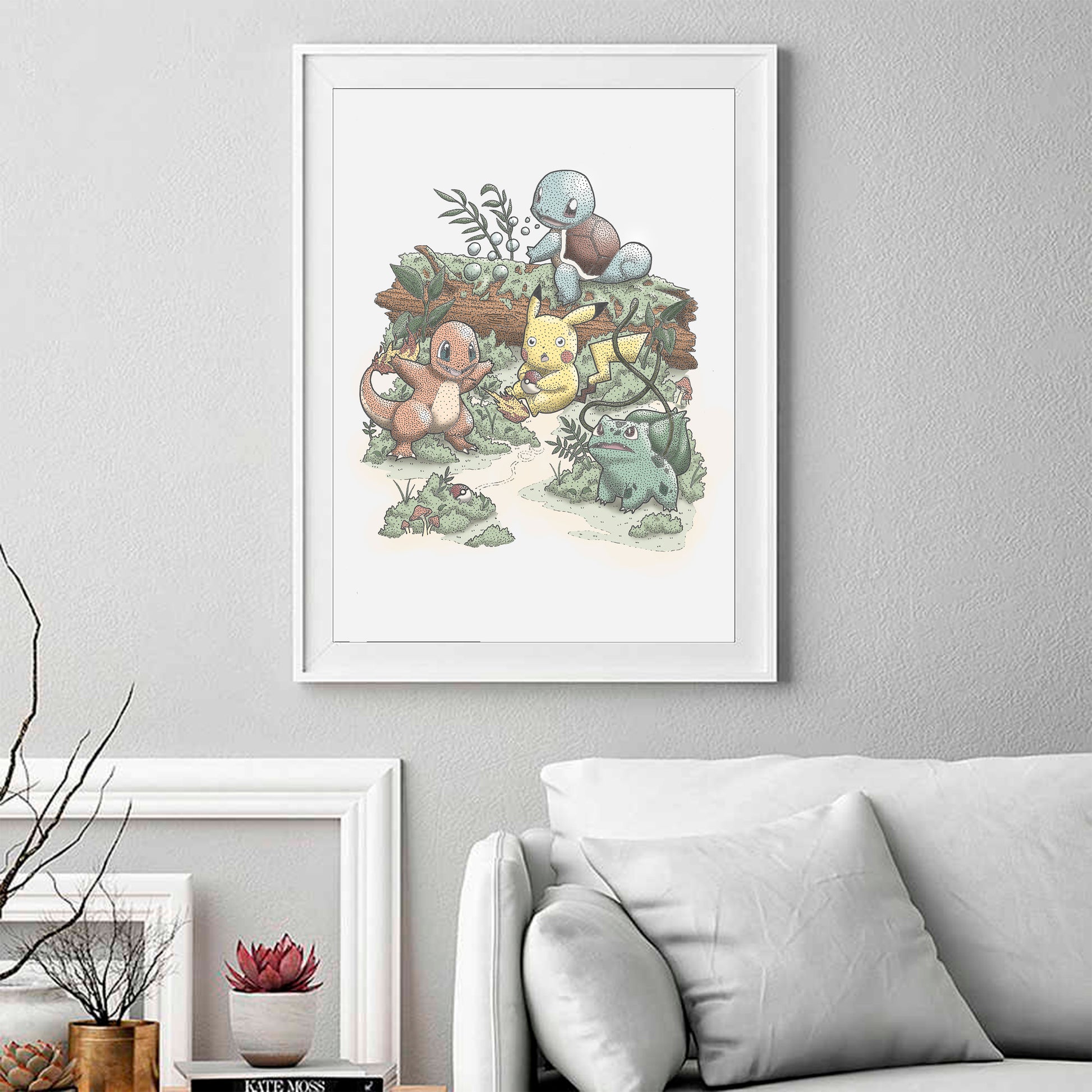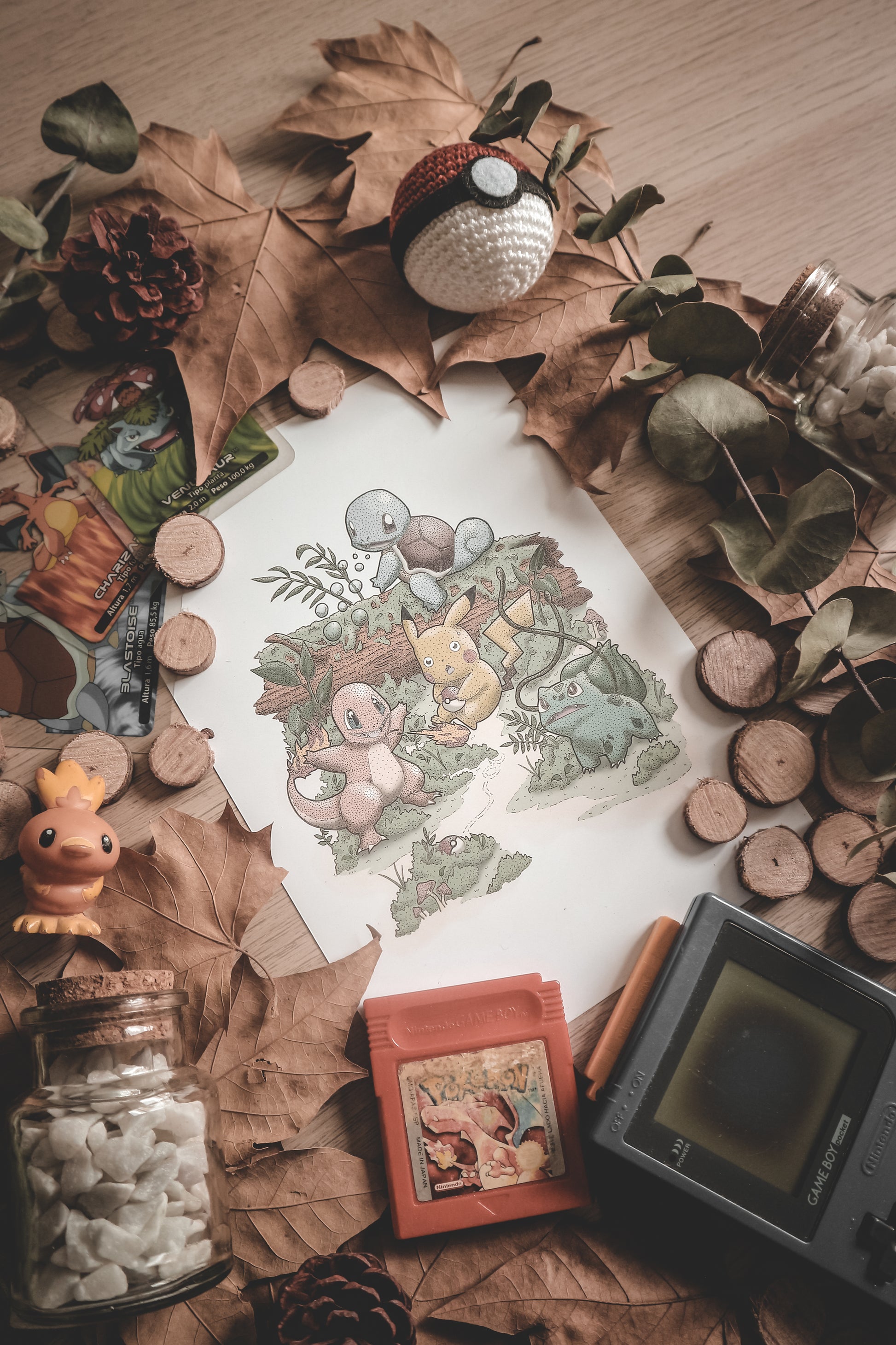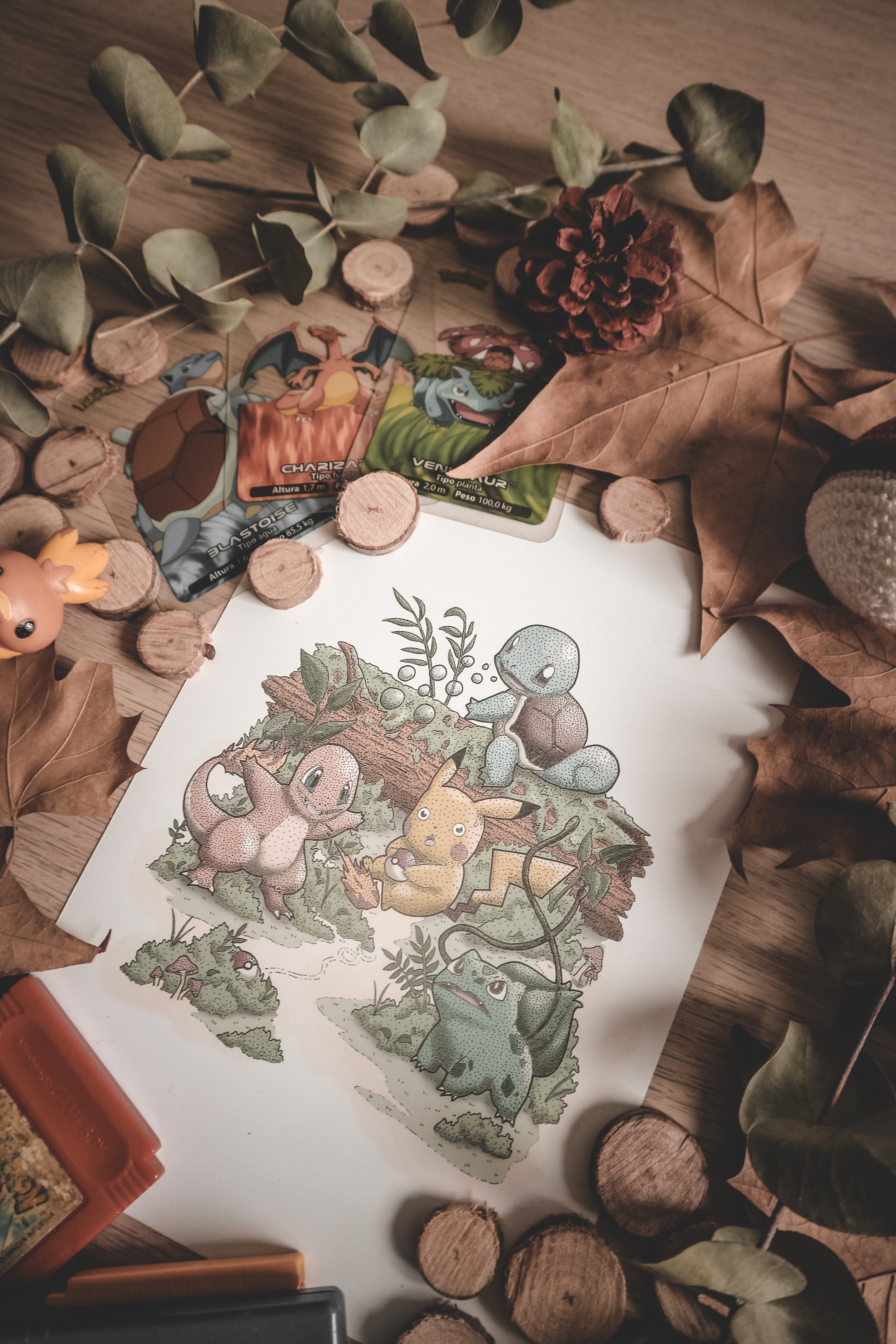 🎨 En la ilustración aparecen los cuatro iniciales de la región de Kanto presentes en los videojuegos de la primera generación de Pokémon: Charmander, Squirtle, Bulbasaur y Pikachu.