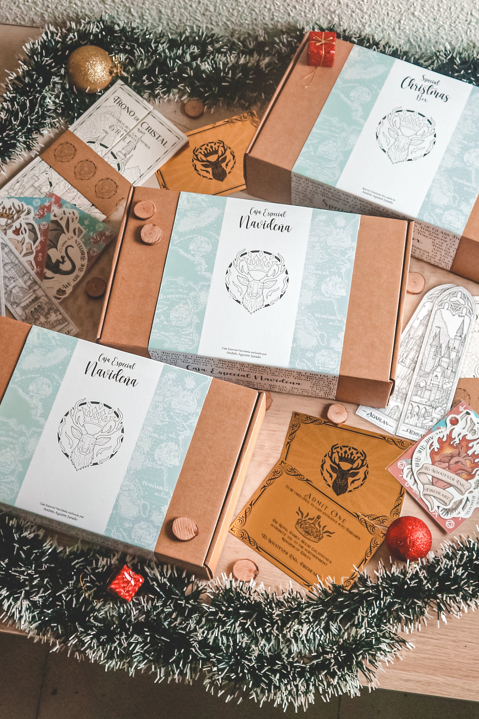 Caja Especial Navideña CON LICENCIA OFICIAL que incluye el mapa del Erilea presente en la saga de libros "Trono de Cristal" de la escritora Sarah J. Maas. Este producto es un mapa desplegable diseñado e ilustrado enteramente por Andrés Aguirre y preparadas y montadas junto a Nerea Cárdeno.