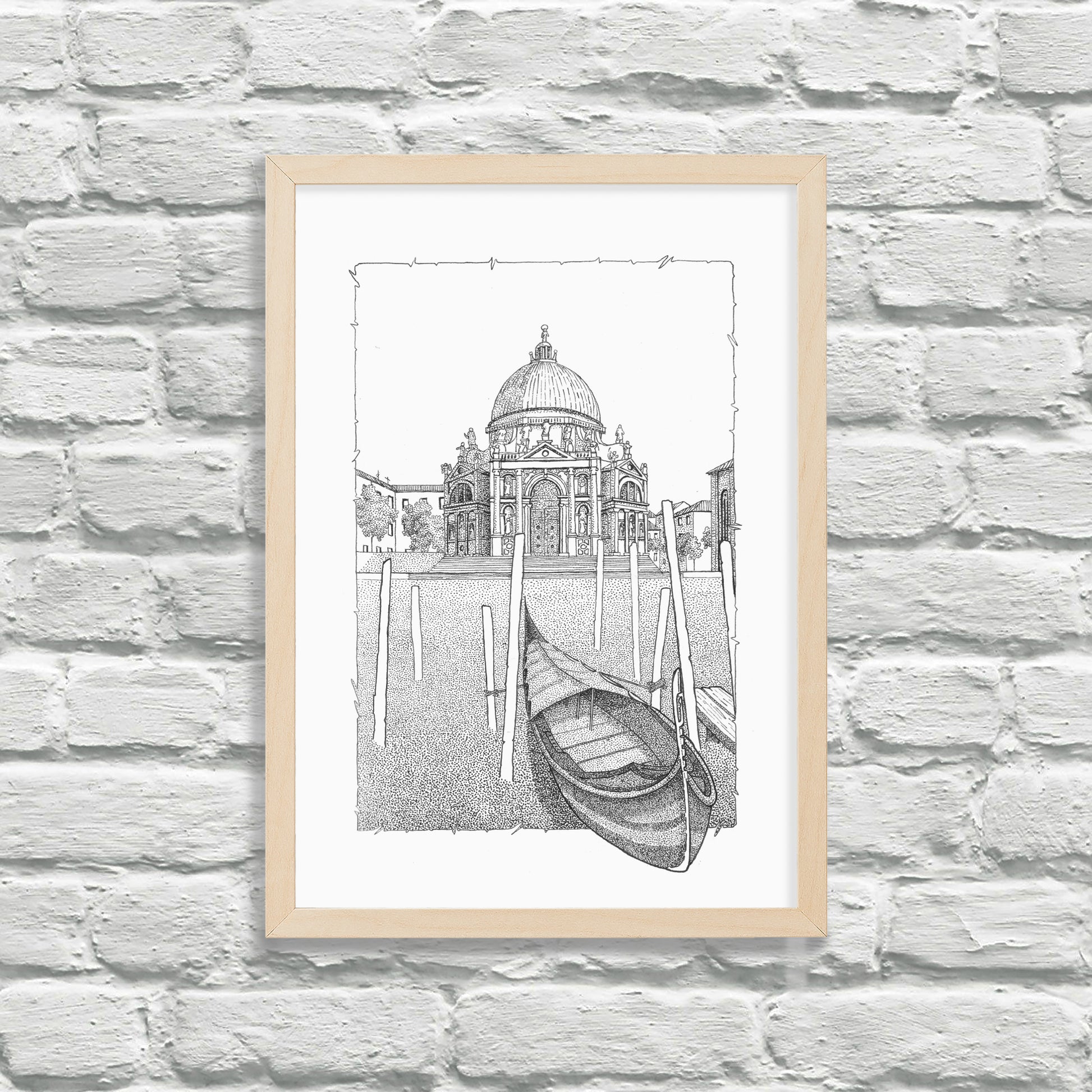 🎨 Esta ilustración es un diseño realizado en la ciudad de Venezia, en Italia. En ella se puede ver una góndola parada sobre el Gran Canal y en el fondo la Basílica de Santa María della Salute